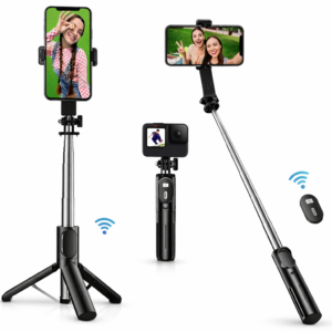 Tripé portátil com conexão sem fio e controle remoto, ideal para gravar vídeos, fazer chamadas, lives ou fotos com estabilidade e praticidade no dia a dia.